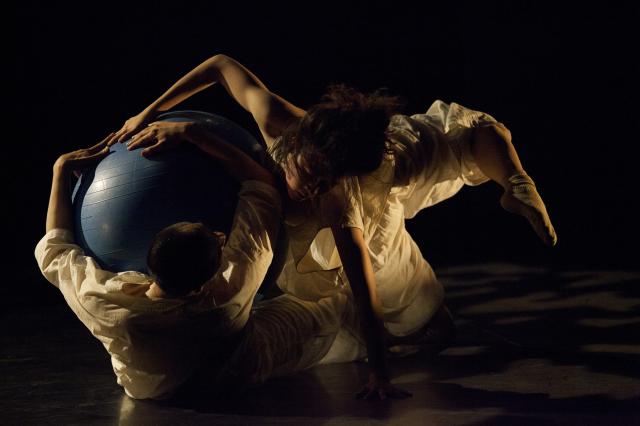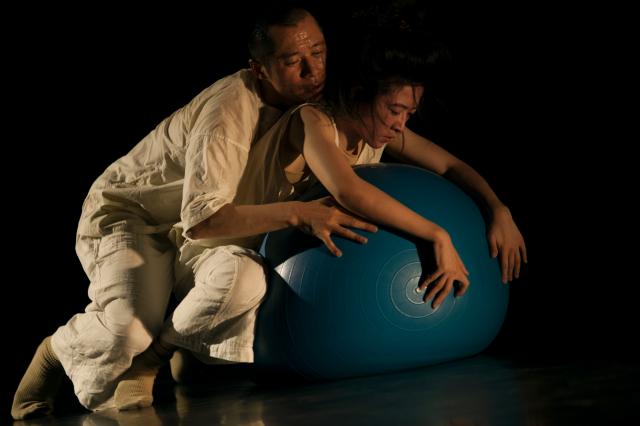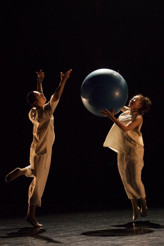 在素材编创阶段,我们一方面根据健身球的特质,实验单人、双人与健身球的各种能动形式。与此同时,从作品的角度,我们亦对所摸索出的形式的表现性进行感知。